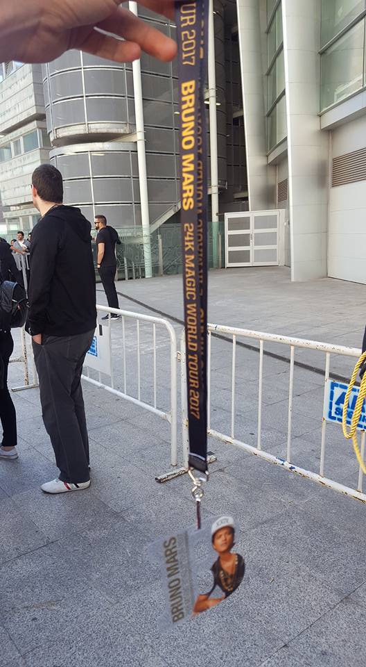 Juantxo llegó unos segundos antes de que empezara la acreditación, afortunadamente pudimos entrar juntos y tras hacer la revisión de la compra de las entradas nos acreditaron y nos entregaron nuestro regalo oficial de la gira: un bolso con el logo del disco -XXIVK- en cuyo interior había un albornoz que Bruno lució en el videoclip de 24K Magic, canción que da título al disco.
