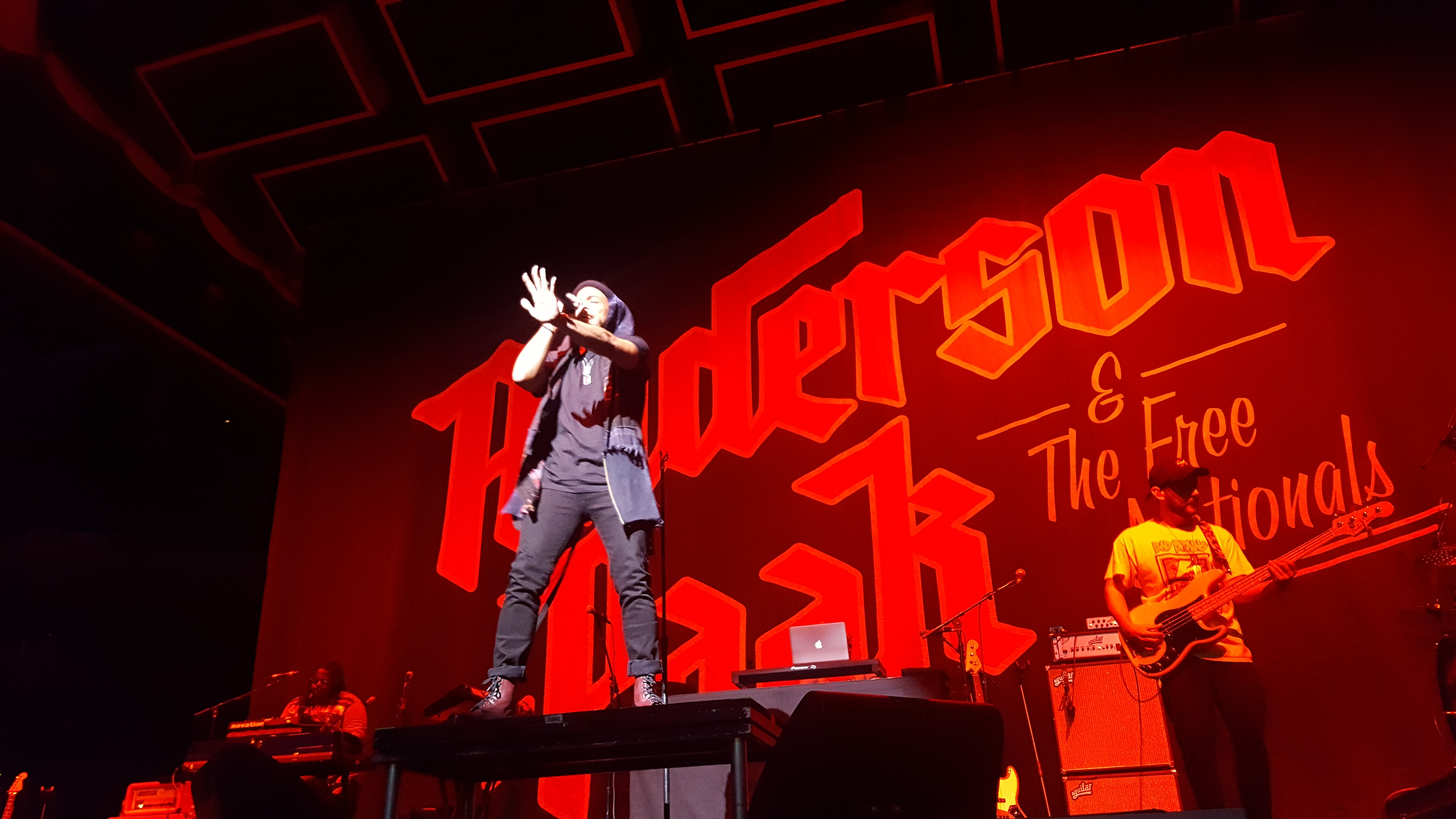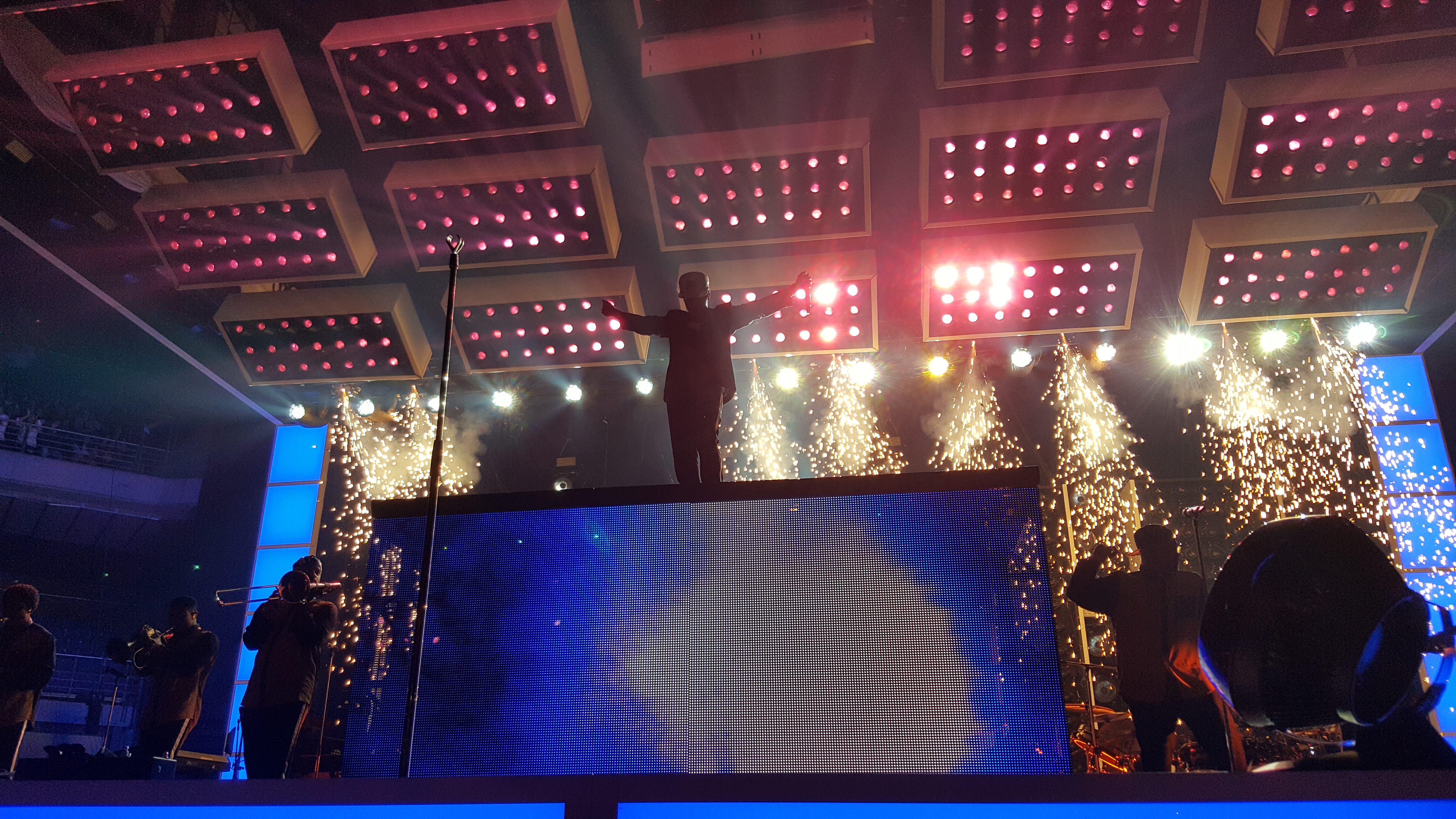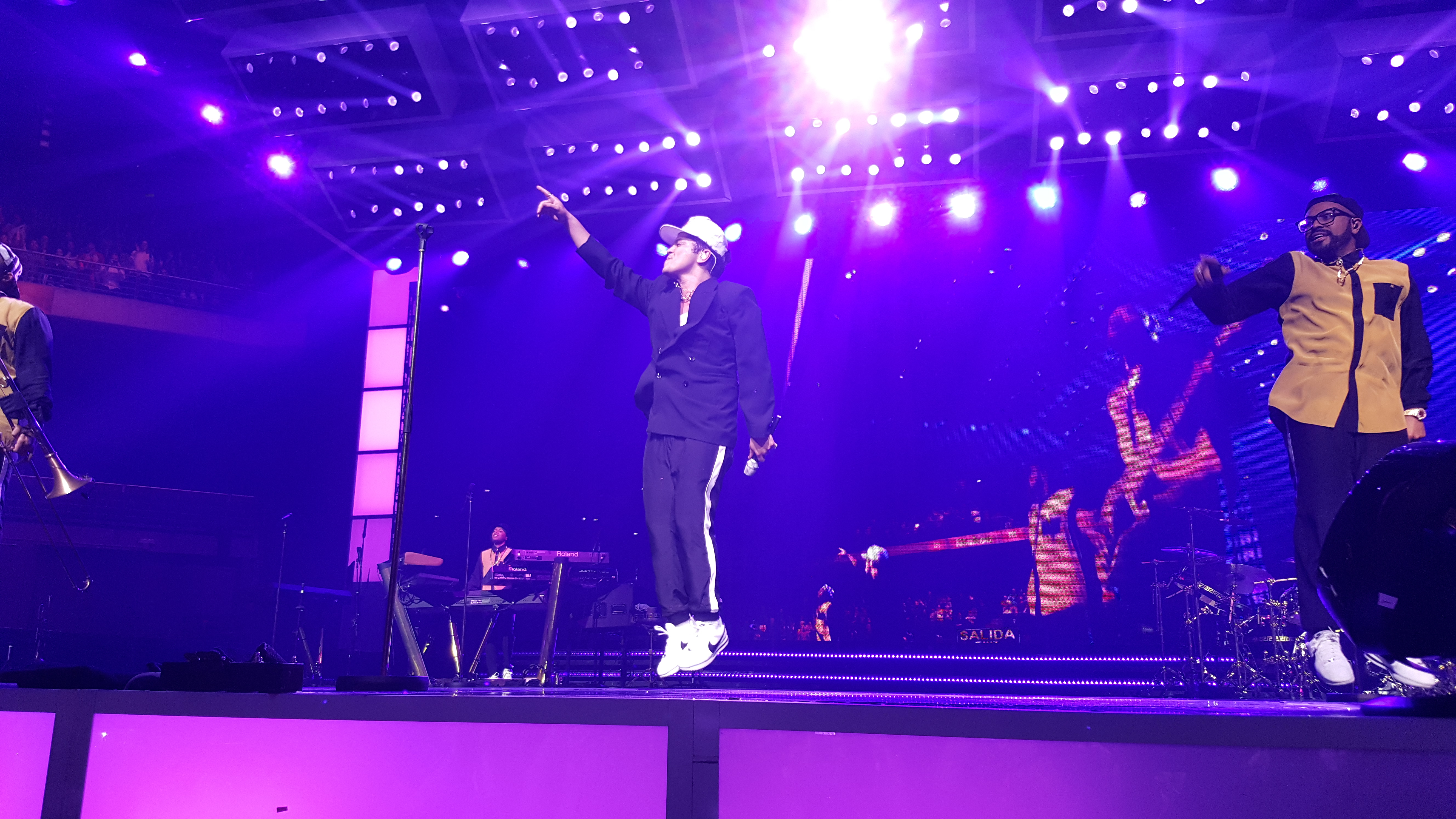 Cerca de las 19:40 horas o un poco más tarde, las luces del WiZink Center se apagaban para recibir en escena a Anderson Paak, el telonero de Bruno, un rapero americano que, con su buena vibra, su respetable música y su rollo se ganó a todo el público -o parte de él, pues el recinto apenas se estaba llenando- y supo muy bien cómo transmitir su buena onda a los asistentes. Yo no paré de moverme y de mover los brazos de arriba a abajo durante su actuación; también debo confesar que nunca en mi vida había asistido a un show de rap ni he visto a un rapero en vivo antes, pues el rap no es de mis estilos favoritos y al no haberlo escuchado nunca, no he desarrollado ningún tipo de atracción hacia el género. Después de un repertorio muy completito -corto, eso sí-, Anderson Paak se despedía dejándonos calentitos para recibir a Bruno Mars alrededor de las 21:00h. o un poco más tarde… ya sabéis que no todos los artistas son puntutales.