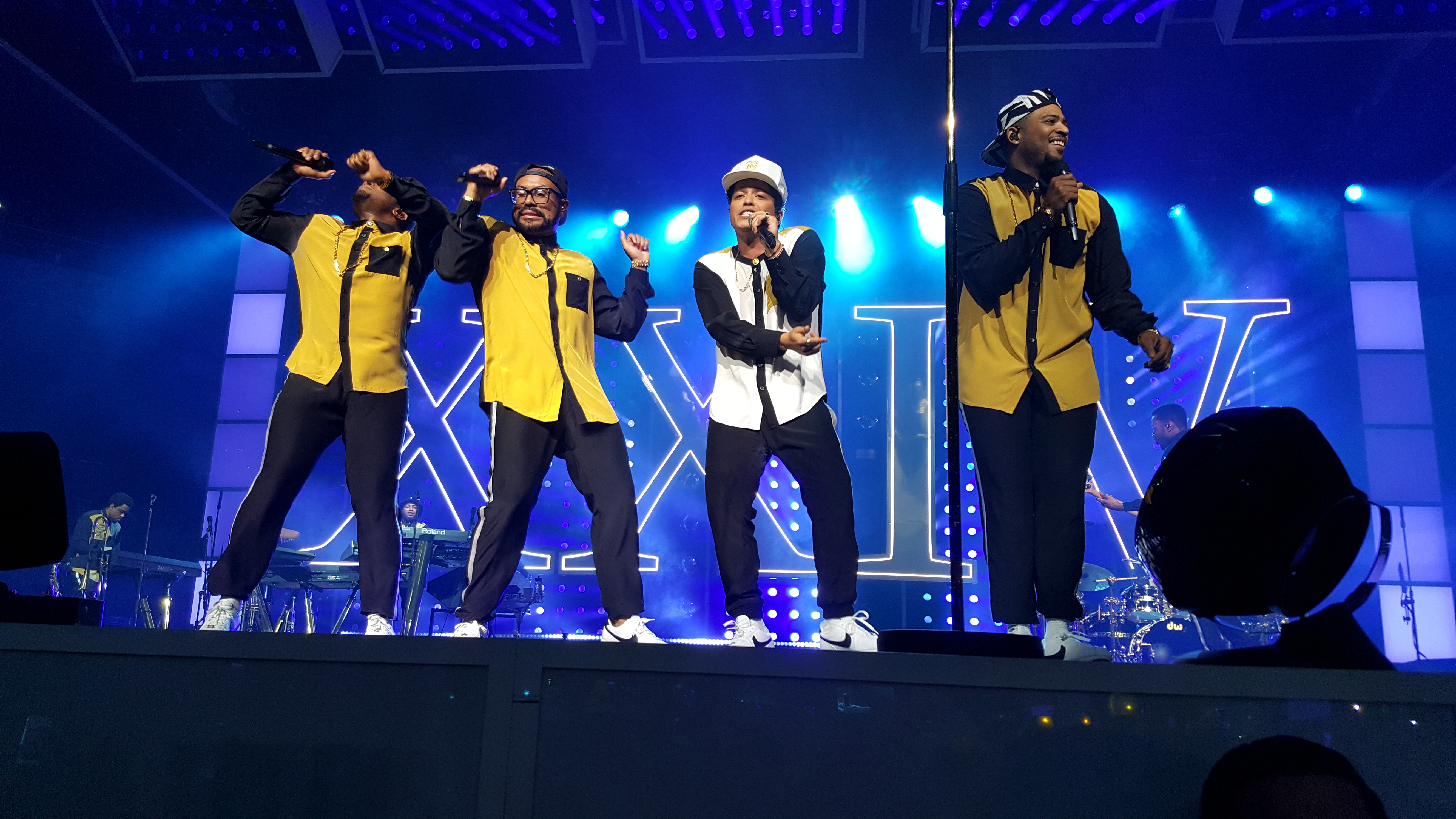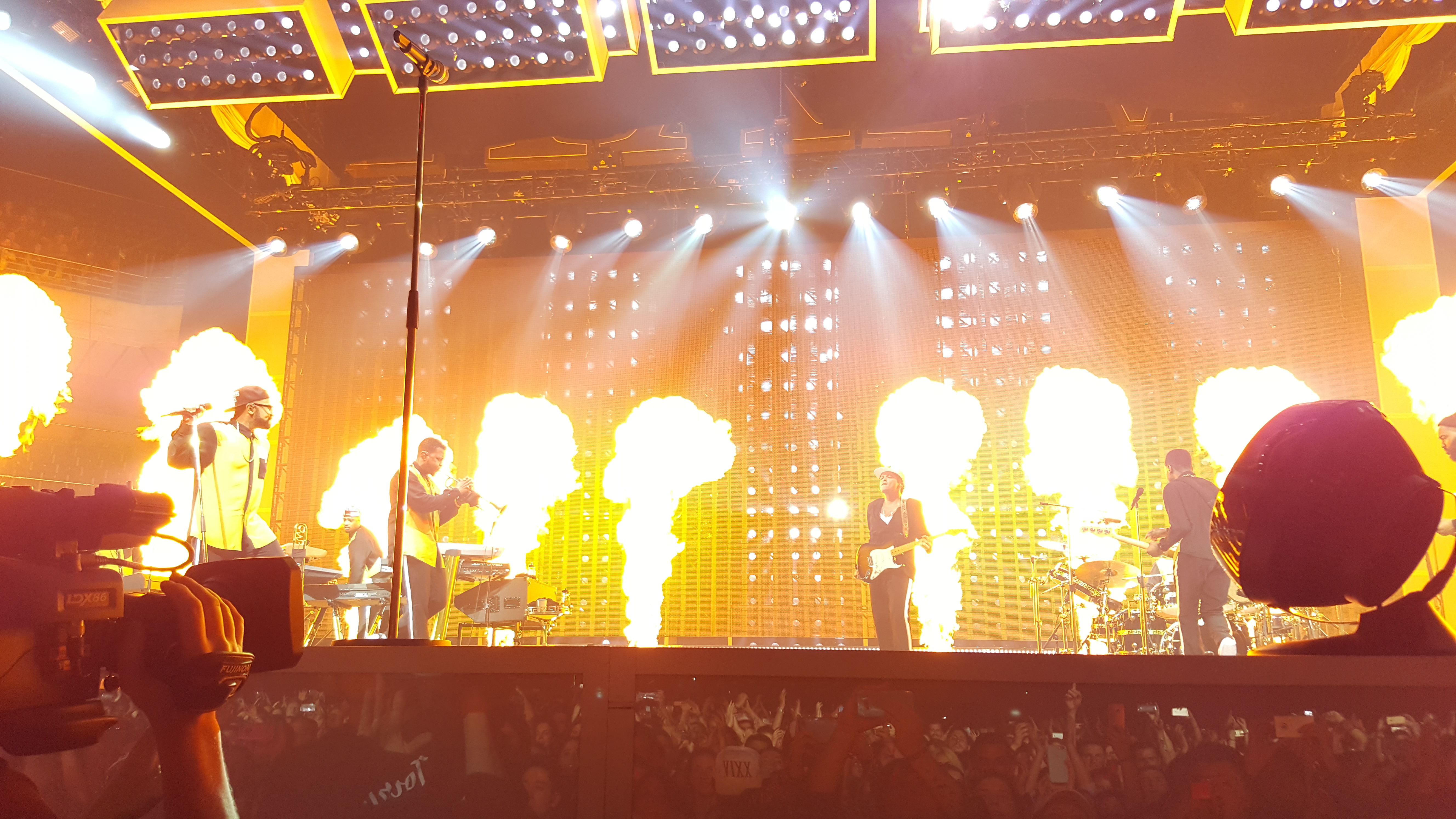 El siguiente tema que sonó no podía ser ni más ni menos que «24K Magic», la canción que da título a su disco y a esta gira; mientras iban sonando las primeras notas de la canción, del techo iba bajando un XXIV gigantesco, que no hizo más que brillar acompañado de un increíble espectáculo de pirotecnia que explotaba cada vez que Bruno llegaba al coro, llevándose constantemente las alabanzas y gritos de un histérico WiZink Center que tampoco paraba de cantar. Antes de dar paso a «Treasure», Bruno tuvo un pequeño gesto con los fans que estábamos en primera fila y desde mi ubicación, señalándome, levantó el brazo para luego abrirlos a todo el recinto y dedicarnos la canción.Sin duda alguna, la locura y verdadera histeria se apoderó de todos -sobretodo de la zona de pista- cuando le tocó el turno a «Perm», porque tanto Bruno como sus músicos y su corista se marcaron una coreografía que, acompañada de su puesta en escena y el ritmo que la banda le daba a la canción, hicieron de esa canción un disfrute total para todos nosotros… fue absolutamente increíble; tras un único subidón, el ambiente se relajó al tocar «Calling All My Lovelies», donde a la mitad de la canción Bruno sacó un teléfono móvil para hablar con su supuesta pareja y se atrevió a hablar algo de español, enloqueciendo, sobretodo, al público femenino que no dejaba de gritar y alabar su nombre una y otra vez; «Chunky» la dedicó a todas sus seguidoras, que coreaban a viva voz las partes en las que la voz femenina que interviene en la canción sonaba en el escenario y enloquecían sin parar -sobretodo en mi lado izquierdo, que se morían de amor mientras cantaban junto a la voz femenina-