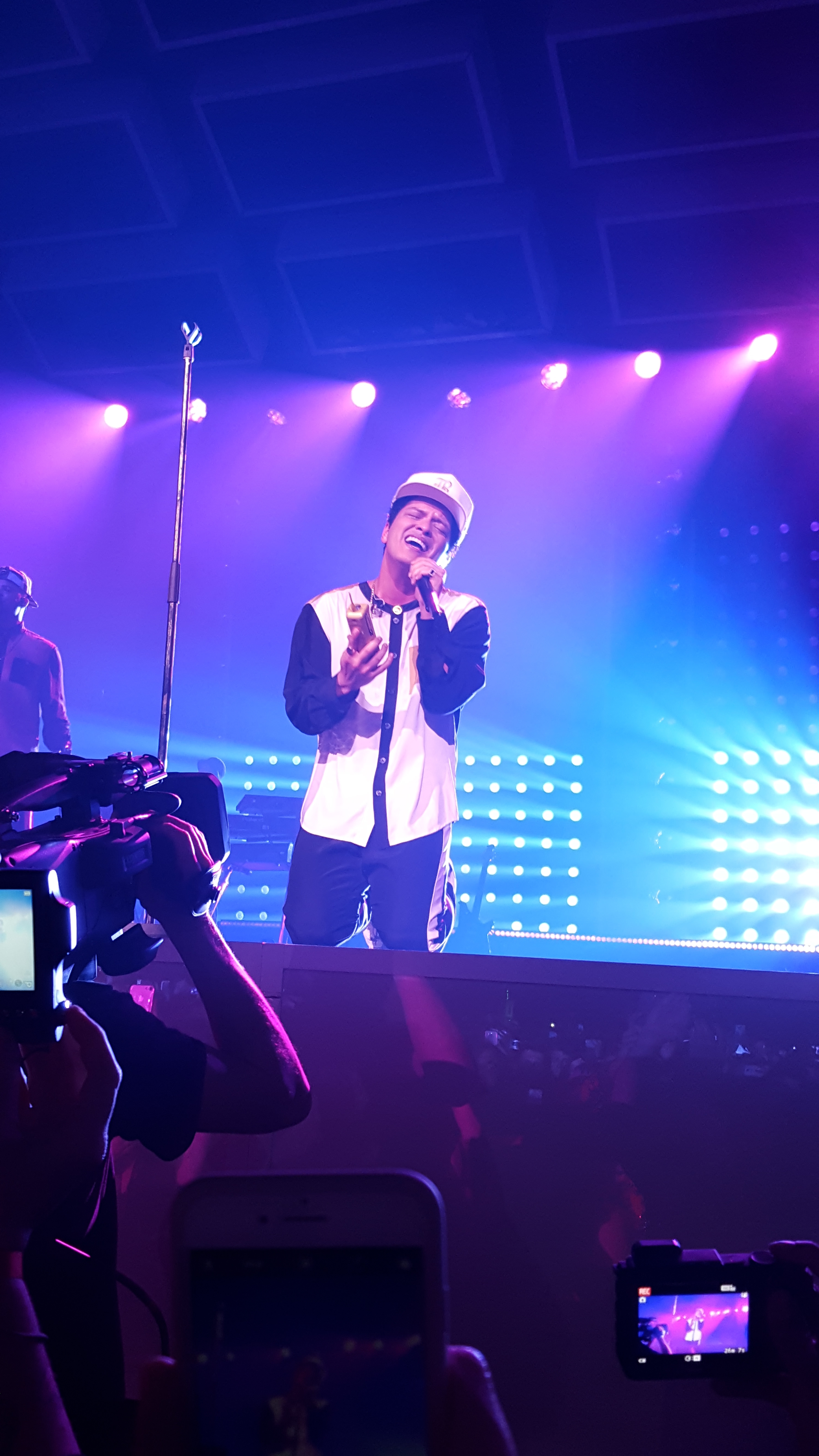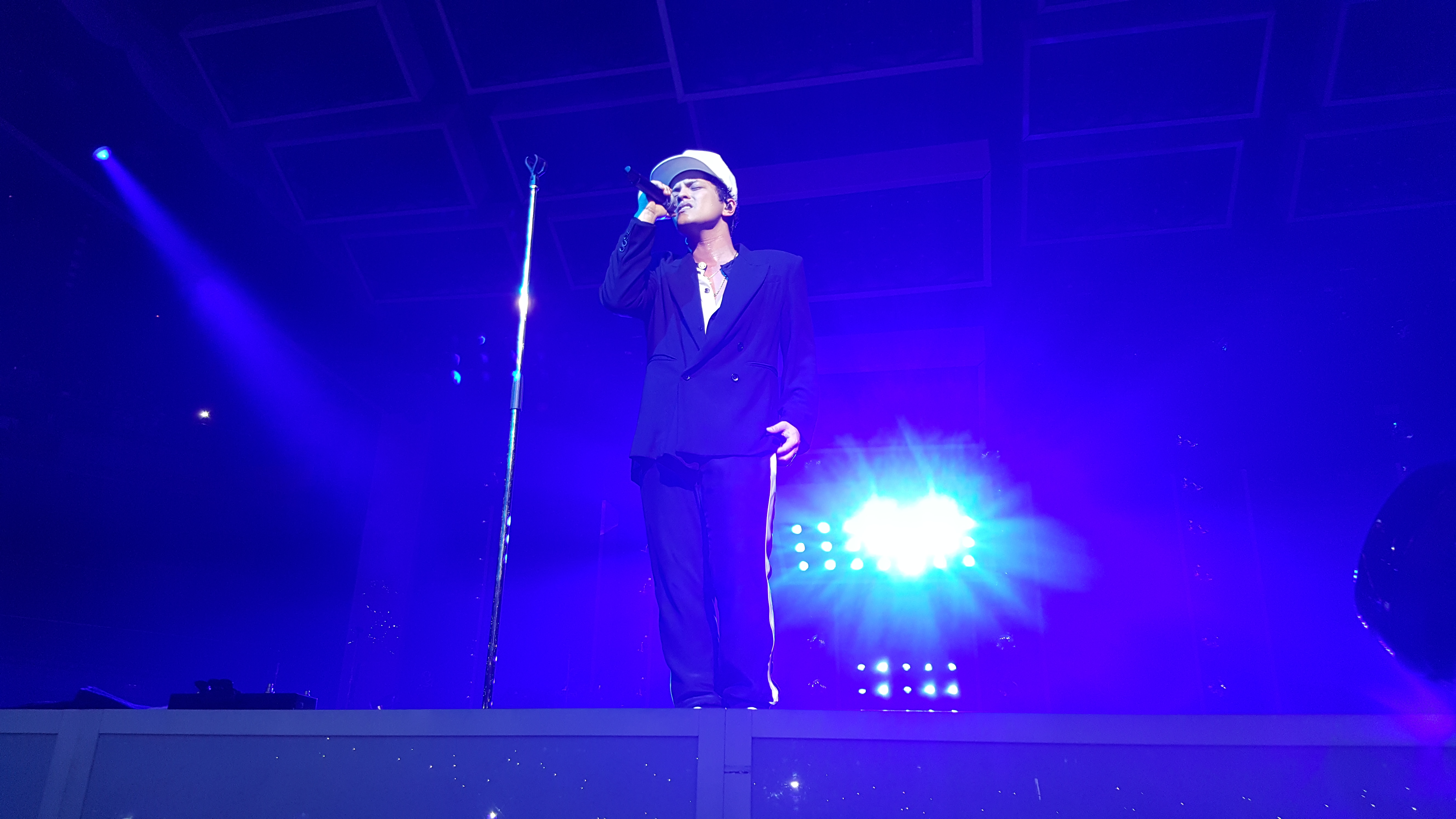 Tras un momento de calma, comenzó a sonar una melodía con un ritmo muy funk mientras Bruno reaparecía una vez más en escena para continuar la fiesta con «Uptown Funk», aquí quiero resaltar mucho al batería, que le aportó mucho ritmo y sabrosura a la canción por la forma de tocar y el sonido que producía; también cabe destacar que Bruno y la banda recrearon la coreografía del videoclip, llevándose grandes alabanzas por parte de todos y para darle un buen final, aparecieron dos bomberos abriendo unos extintores que, junto a los ventiladores, crearon unas increíbles ráfagas de humo con las que Bruno supo jugar muy bien para camuflarse hasta que la canción terminó. Y como broche final, el repertorio de la noche terminaba con «Too Good To Say Goodbye» para volver a calmar los ánimos, me atrevería a decir que la intensidad con la que esta canción fue tocada e interpretada fue mágica, tanto que a mitad de la canción los focos se apagaron, dejando sólo las luces del escenario para observar la silueta de un Bruno emocionado, que nos cantó -en inglés, obviamente-