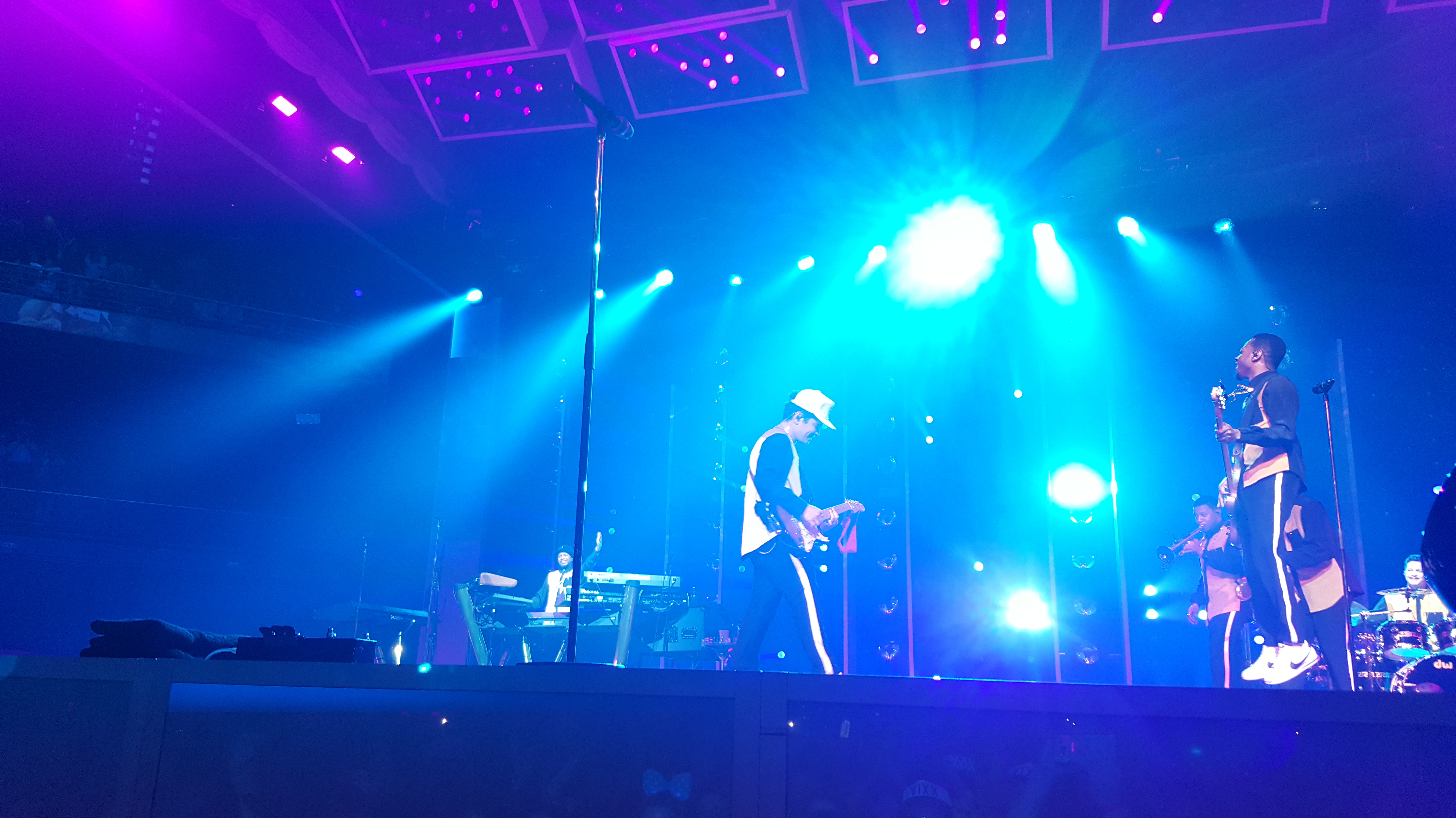 Eso sí, no se quiso despedir de nosotros sin antes darnos las gracias por asistir y por una noche tan especial y dedicarnos «Just the Way You Are», mi canción favorita, y para qué voy a mentir: durante la canción no pude evitar emocionarme y soltar alguna lágrima, pues esta canción tiene un significado muy especial para mí, me traslada a un momento muy específico de mi etapa de transición de adolescente a adulto y me trae muy buenos recuerdos de ello… antes de seguir adelante, Bruno, sus coristas y los instrumentistas de viento se unieron en pequeño corrillo para dar un rollito de petit comité a la canción con sus voces y tras agradecer a todos mandando besos a todos los lados del recinto, nos invitó a cantar el coro entero y el momento que viví -y que además grabé- fue mágico: escuchar a un Palacio de los Deportes completo cantar esta canción me puso los pelos de punta, de verdad que no tengo palabras para explicar lo que sentí y lo que este momento me transmitió. Antes de terminar, Bruno nos presentó a su banda comenzando por los guitarristas, siguiendo al batería, teclados, instrumentistas de viento y terminando por su corista, que además se encargó de hacerle una introducción digna al propio Bruno Mars; la canción siguió mientras Bruno se despedía y desaparecía de escena de un Palacio de los Deportes que estaba más que rendido a sus pies, dejando a su banda animando y terminando a lo grande la canción.